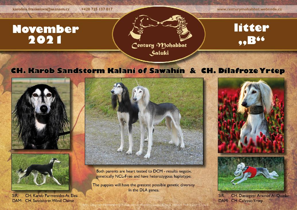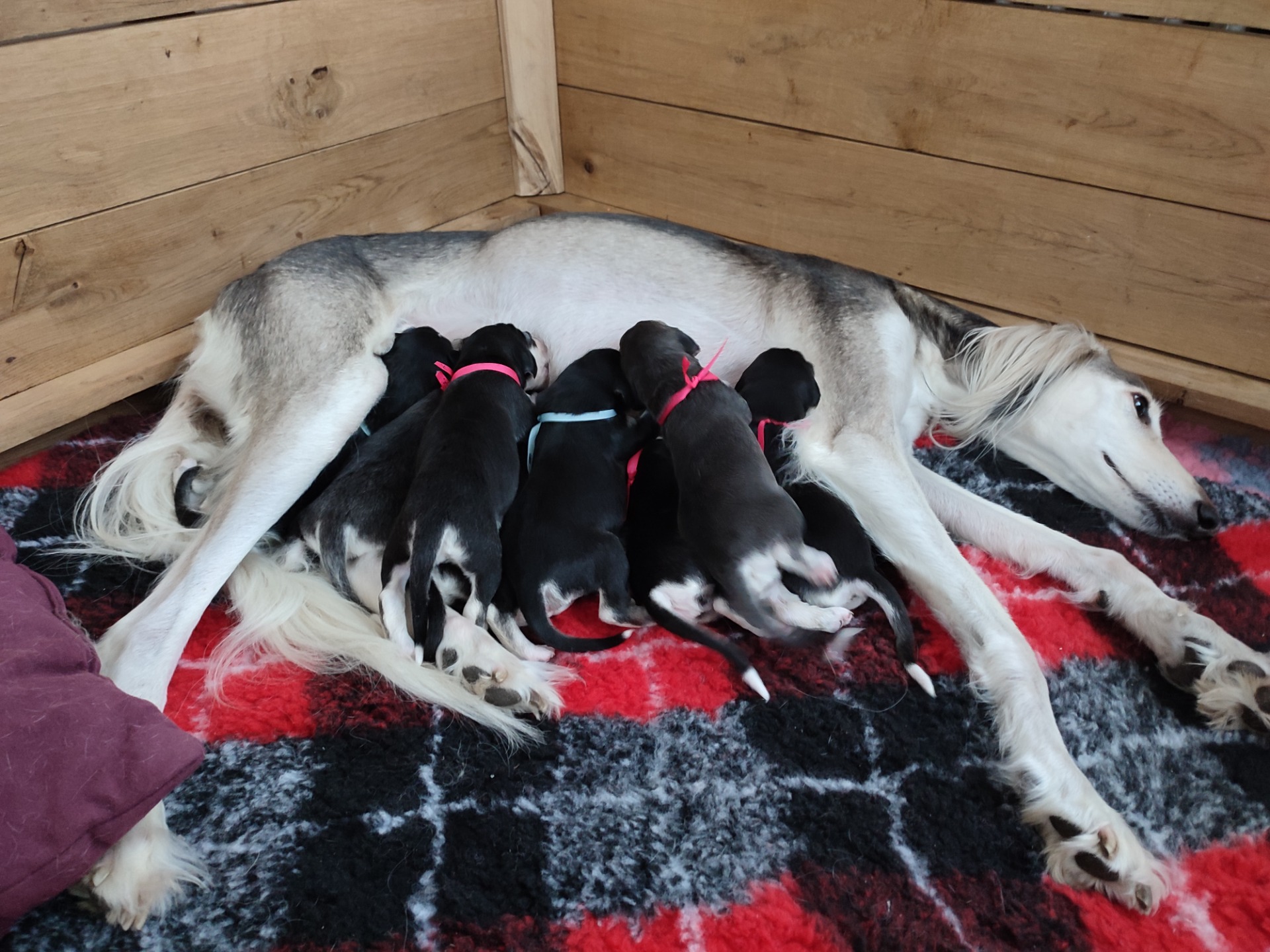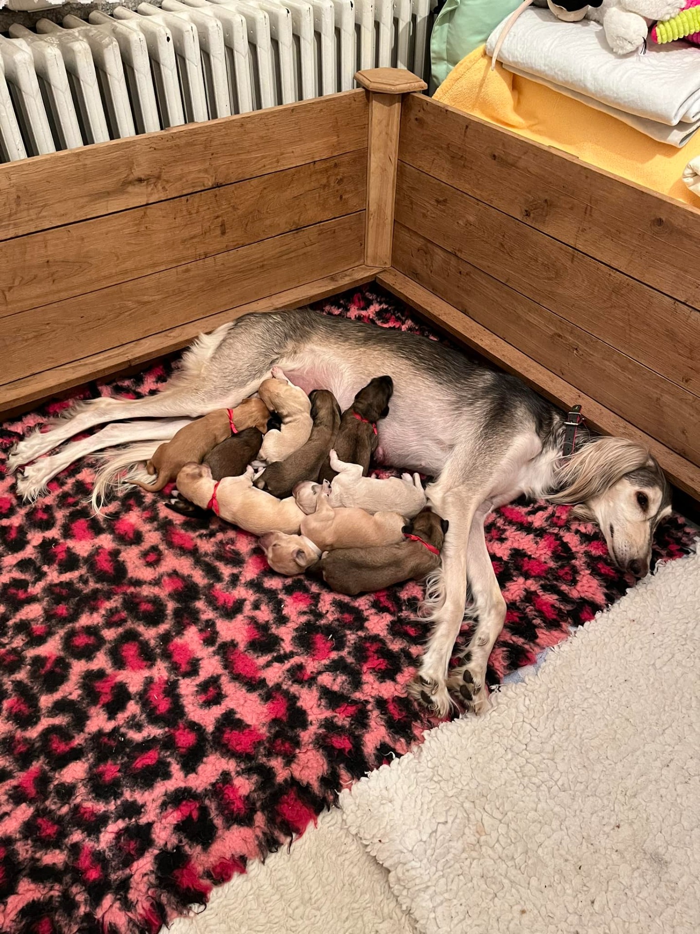 16. 8.2024 přivedla naše Andulka (C.I.B. Anusheh Century Mohabbat) na svět devět krásných štěňátek. Otcem čtyř pejsků a pěti fenek je červený pes Multi CH. Abisha Arshan Devon Exe v majetku paní Hany Jiráskové. Oba rodiče byli kardiologicky vyšetřeni s negativním nálezem a geneticky testovaní na NCL. Máma Anusheh i štěňata jsou v pořádku a těší se...